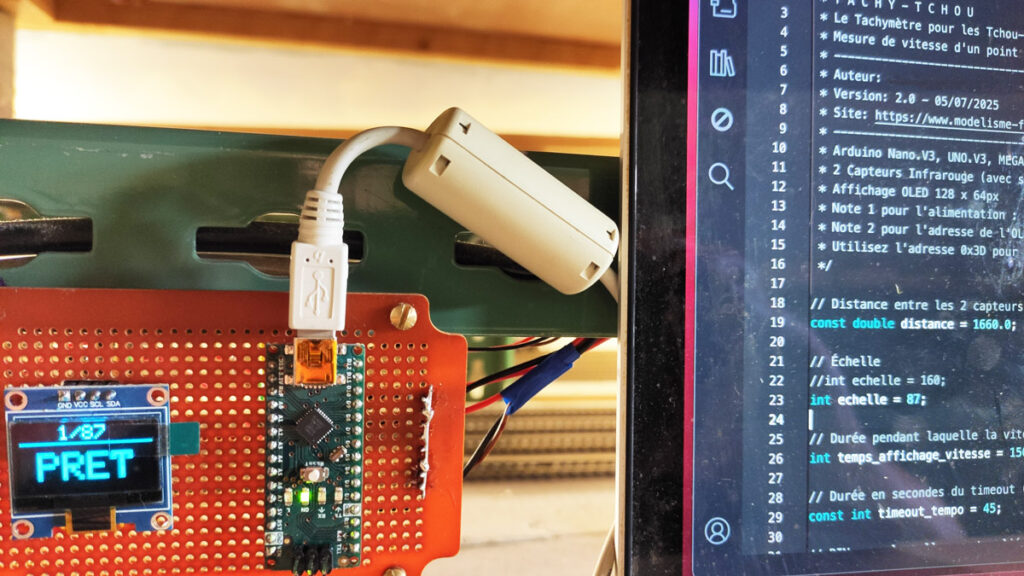 Mais dans le cadre du modélisme ferroviaire, la distance entre les 2 capteurs sera multipliée par l’échelle des modèles. Le calcul final intégré dans le code est donc :