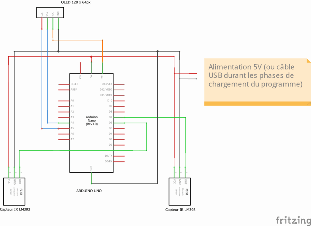 Le schéma de câblage réalisé avec « Fritzing » montre la connexion des capteurs aux broches D6 & D7 et de l’écran OLED aux broches A4 (SDA) et A5 (SCL). Ici rien de compliqué. L’Arduino est alimenté par le port USB, notamment durant les phases de chargement du programme. Et par une alimentation 5V externe en utilisation quotidienne.